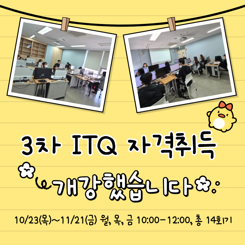ITQ 엑셀 자격취득을 위해 10~11월 한 달간 열심히 참여할 우리 친구들에게 많은 응원과 격려 부탁드립니다. 화이팅 :D