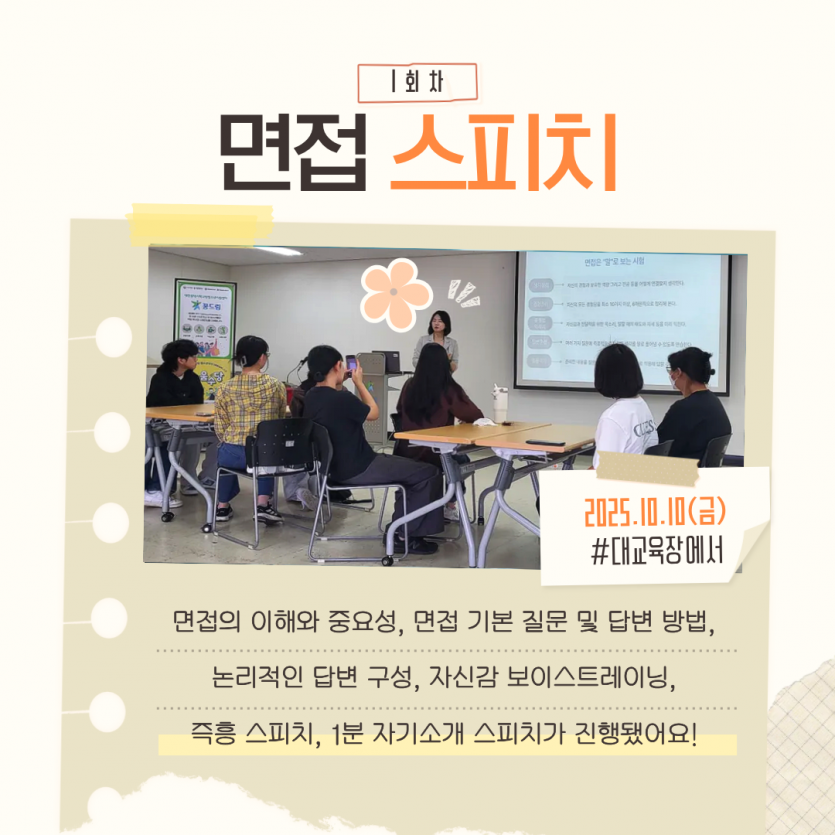 대전광역시학교밖청소년지원센터에서는 청소년 10명을 대상으로 2025년 10월 10일(금)~10월 24일(금), 총 3회기에 걸친 파워스피치(면접) 자립지원 프로그램을 진행하였습니다.