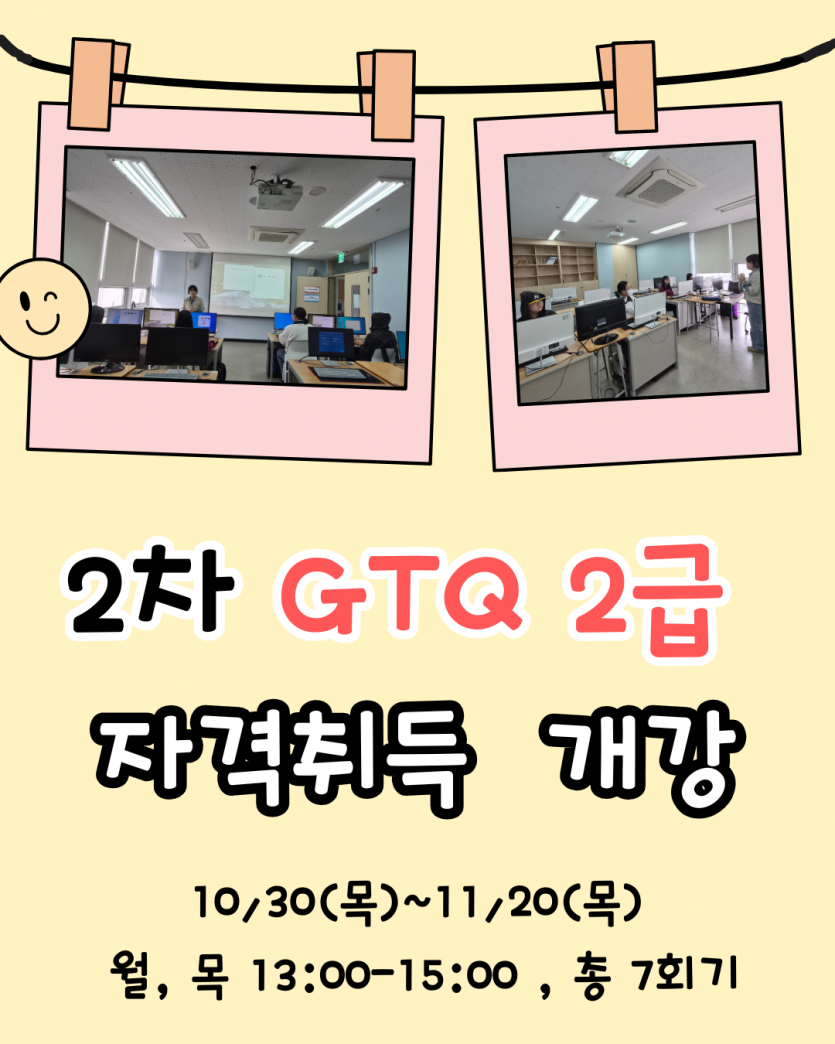 대전광역시학교밖청소년지원센터에서는 청소년 4명을 대상으로 2025년 10월 30일(목)~11월 20일(목) 매주 화, 목 13:00-15:00, 2차 GTQ 2급 자격취득(7회기) 과정을 운영합니다.