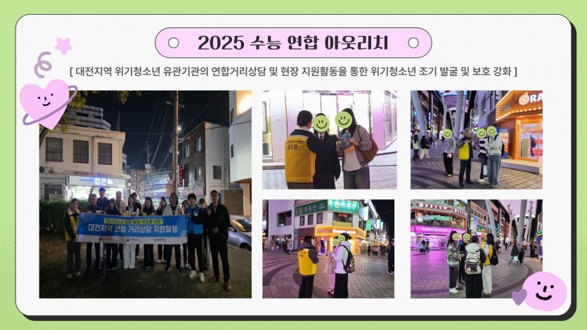 대전광역시학교밖청소년지원센터는 2025년 11월 14일(금) 19시부터 ‘수능 연합 아웃리치’를 진행하였습니다.