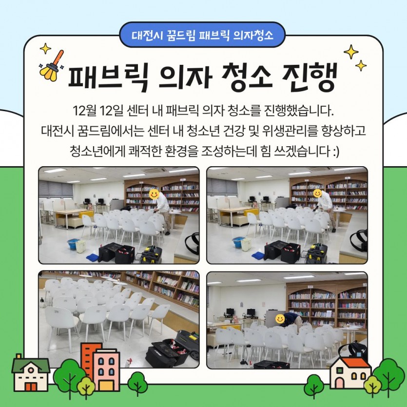 지난 12월 12일(금), 대전광역시학교밖청소년지원센터(대전시 꿈드림)에서는 센터 곳곳에서 사용하던 패브릭 의자들을 깨끗하게 청소하는 시간을 가졌습니다.