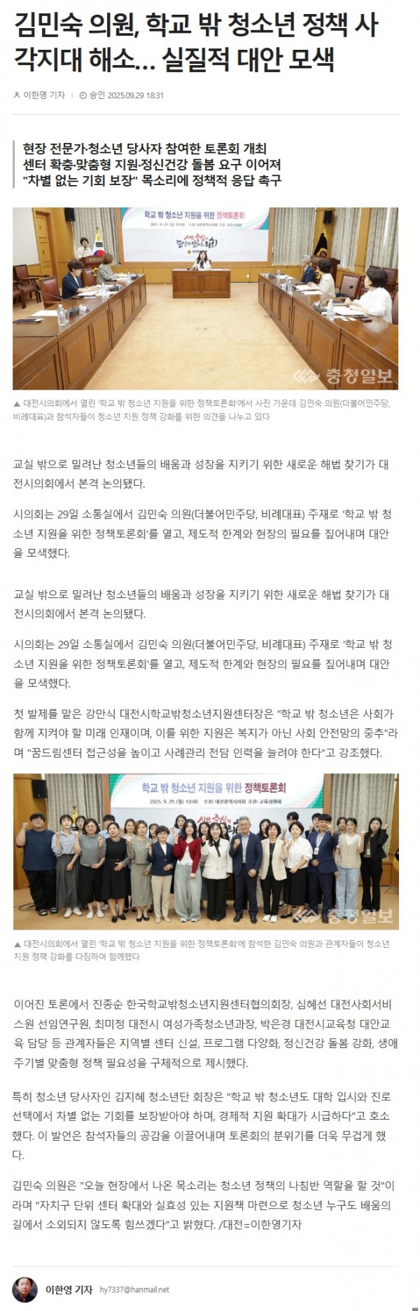 김민숙 의원은 "오늘 현장에서 나온 목소리는 청소년 정책의 나침반 역할을 할 것"이라며 "자치구 단위 센터 확대와 실효성 있는 지원책 마련으로 청소년 누구도 배움의 길에서 소외되지 않도록 힘쓰겠다"고 밝혔다. /대전=이한영기자 hy7337@hanmail.net