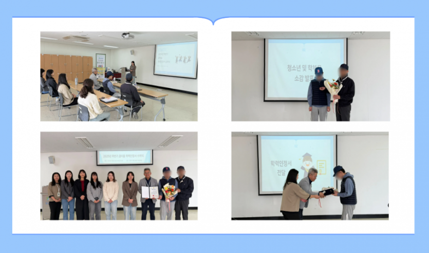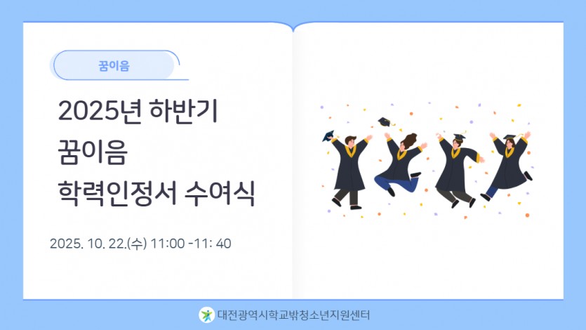 대전광역시학교밖청소년지원센터에서는 10/22(수) 11:00 시부터 2025년도 하반기 꿈이음 학력인정서 수여식이 진행되었습니다.