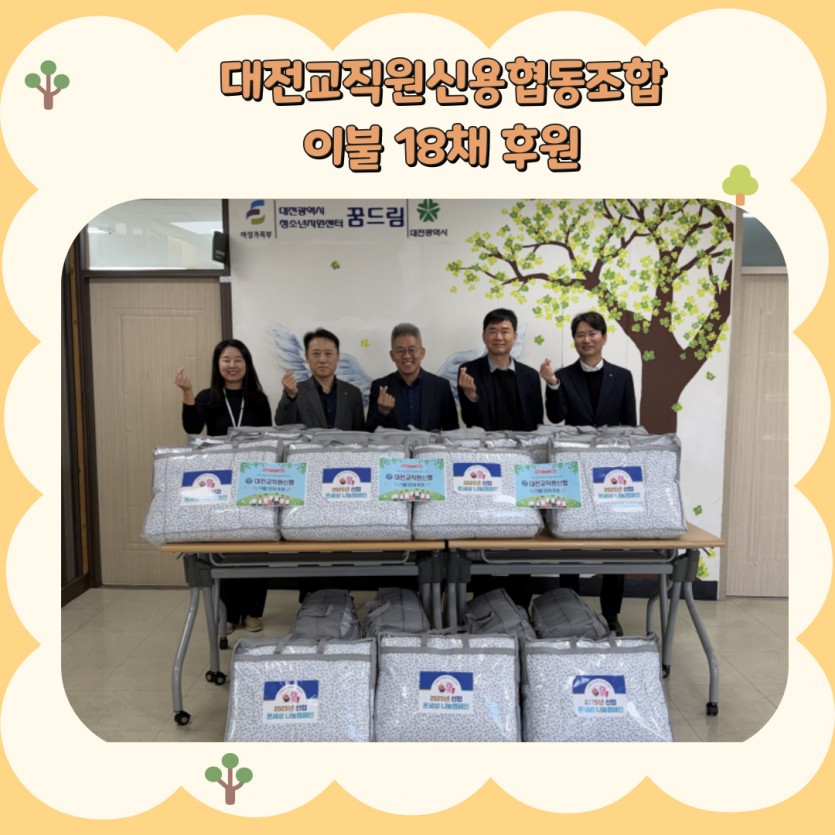 11월 7일(금) 오늘 대전교직원신용협동조합에서 대전시 꿈드림을 방문하여 이불 열여덟 채를 후원해주셨습니다.