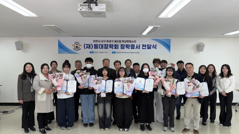 11월 28일(금) 대전광역시학교밖청소년지원센터에서 (재)등대장학회 관계자, 장학생, 대전시·서구·유성구 학교 밖 청소년지원센터 실무자 등이 참석한 가운데 (재)등대장학회 장학증서 수여식을 진행하였습니다.