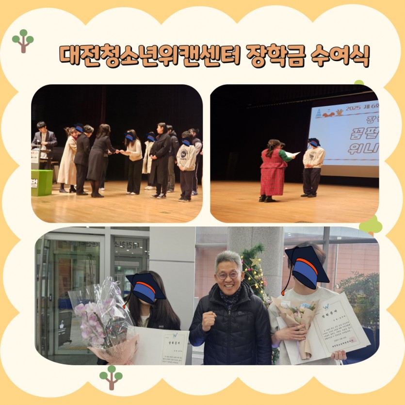 2025년 12월 13일(토) 1시에 청소년위캔센터 대강당에서 진행된 "위캔페스티벌"에서 대전광역시학교밖청소년지원센터 청소년 2명이 장학금을 받았습니다. 장학금은 청소년위캔센터에서 "아나바다" 운동을 통해 모아진 수익금을 지역 청소년들을 위해 지원해주셨습니다. 소중한 장학금을 지원해준 위캔센터장님과 직원분들께도 감사드립니다.