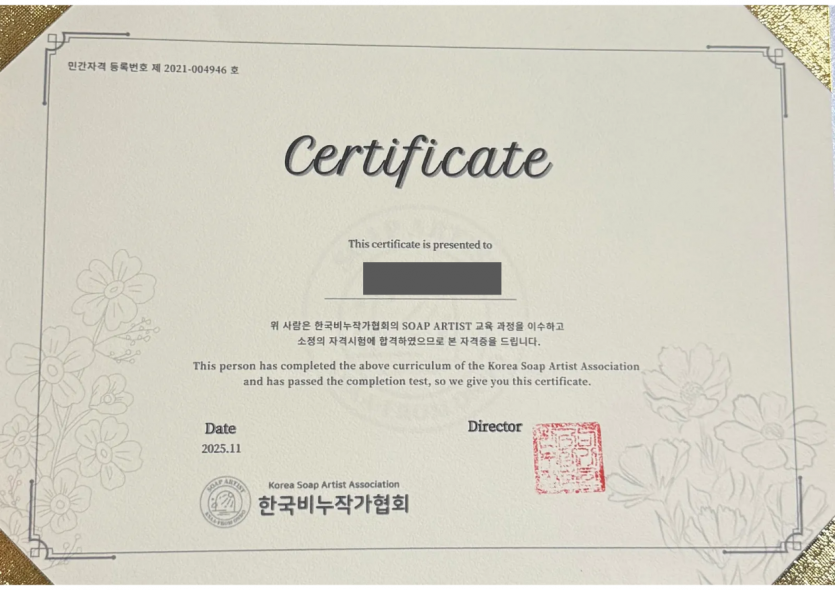 이번 과정은 화학·소재공학 기반 이공계 진로체험 프로그램으로, 비누 제조의 원리와 원료 특성에 대한 이론 교육과 함께 직접 레시피를 설계하고 제품을 제작하는 실무 중심 커리큘럼으로 구성되었습니다. 그 결과, 참여 청소년 6명 전원 KSAA 자격증 취득을 완료하였으며, 해당 자격증은 동일 클래스를 직접 운영할 수 있을 만큼 실무성이 높은 자격증으로 향후 취업 및 창업 연계가 가능한 전문 기술 자격입니다.
