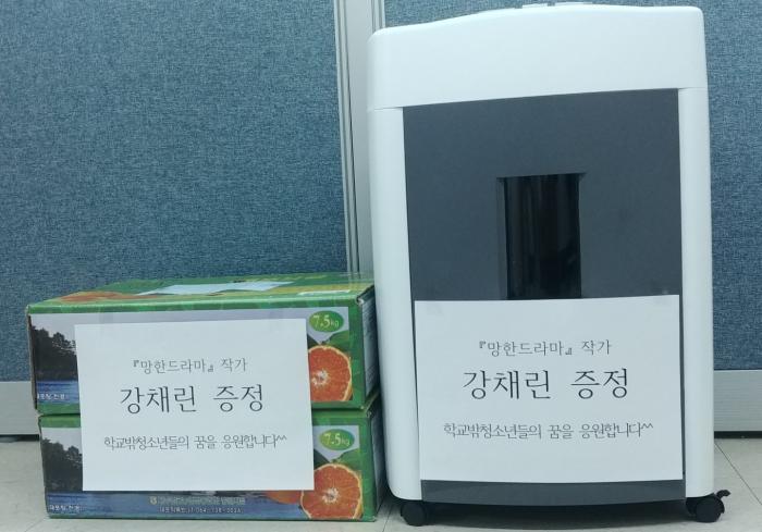 대전학교밖청소년지원센터(꿈드림센터)는 지난 2018년 12월 15일 오후3시, ‘망한 드라마’라는 제목의 시집을 낸 강채린(여·18) 양의 출판기념회를 개최했습니다. 작가 Q&A, 작가와 독자가 추천하는 시낭송, 사인회 등을 통해 독자와 작가가 이야기를 나누고 감정을 공유하는 따뜻한 시간을 보냈습니다. 출판기념회에서 발생한 수익금은 작가의 요청에 따라 후원물품과 청소년들을 위한 과일로 구비하였습니다. 작가이기 전에 청소년으로써 뜻깊은 일에 동참해주셔서 진심으로 감사드립니다.