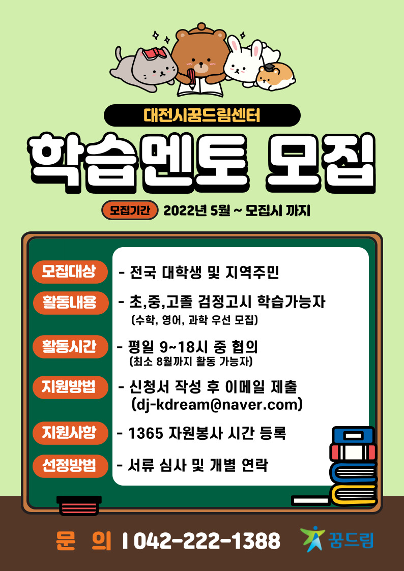 2022년 학습멘토 모집 페이지 정보 작성자 96d60950 댓글 0건 조회 1,178회 작성일 22-05-24 15:04 본문 대전시꿈드림센터에서 학습멘토를 모집합니다.많은 관심과 지원 부탁드립니다. 페이스북 공유 트위터 공유 구글+ 공유 SNS 공유 첨부파일 2022년 학습멘토 신청서.hwp (34.5K) 33회 다운로드 | DATE : 2022-05-24 15:07:35 목록 이전글2022년 제2회 검정고시 대리접수 안내 22.06.14 다음글직업역량강화프로그램 '꿈JOB고' 2차 참여 청소년 모집 안내 22.04.19 댓글목록 댓글목록 등록된 댓글이 없습니다.